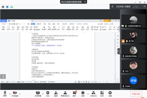 11月9日晚19点,在行政二班班长葛子璇组织下,行政二班班委同学们开展了线上心理培训,并就此阐述自己的心得体会以及日后的工作方向。本次培训内容主要包括传达校级心理培训内容及心理委员阐述自身工作的重要性、工作职责及相关工作注意事项。葛子璇同学首先为大家介绍了心理培训的内容及心理工作的注意事项,随后国际贸易学专业心理委员杜雅茜同学发言,她指出,心理委员的工作有着传递生命影响生命的重要性,心理委员应当时刻关注本班同学心理动向、在班级群分享星语心愿和晓南心语相关推文、为班级学习及生活氛围努力传递正能量、借助新媒体平台实现积极的心理健康教育等。本次培训让心理委员及其他班委进一步明确了自身工作职责。