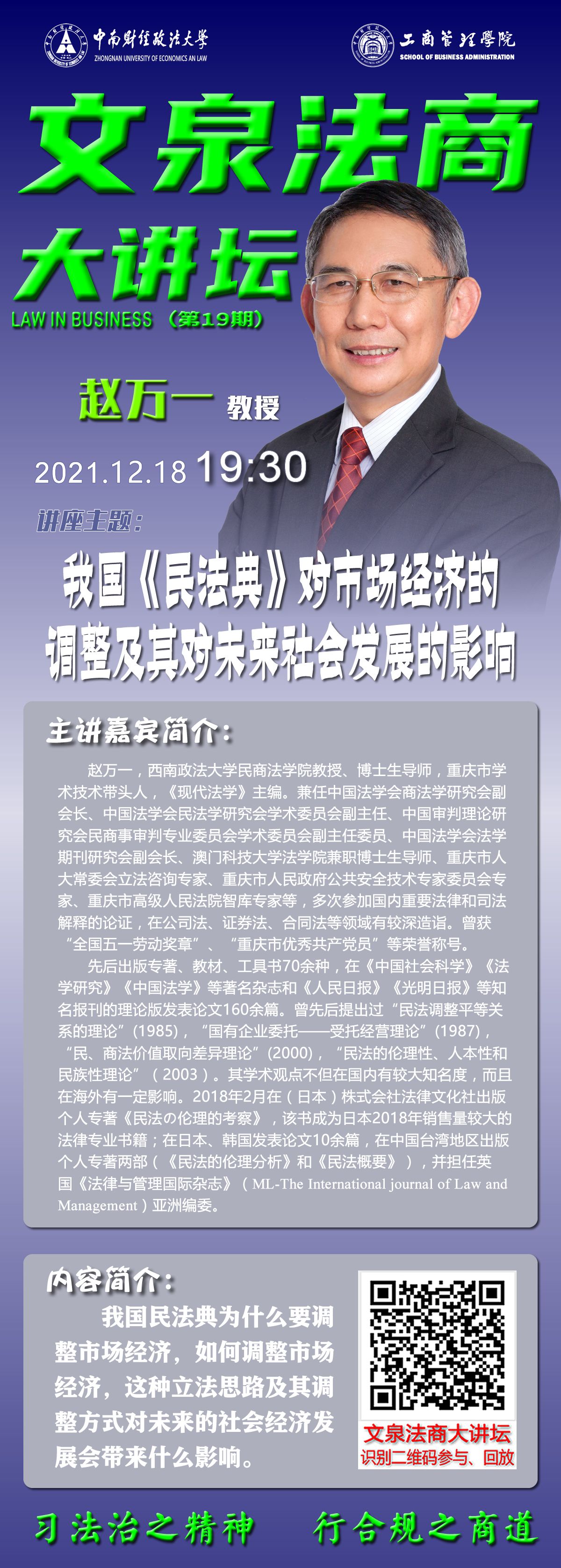 第19期 | 12.18(周六) 19:30 | 赵万一教授 | 西南政法大学民商法学院 | 我国《民法典》对市场经济的调整及其对未来社会发展的影响 |