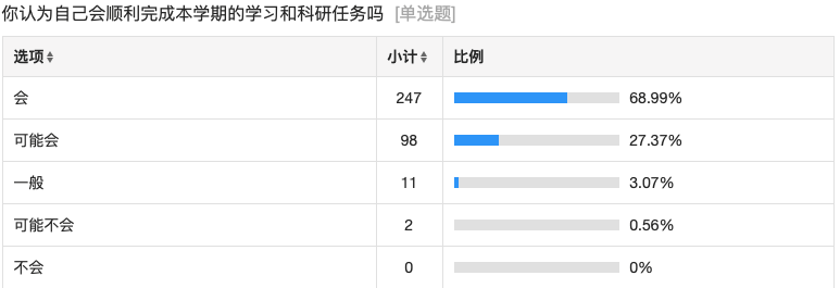 问卷调查显示学生整体精神面貌良好,绝大部分同学新学期的学习目标明确,奋斗方向清晰,心理状态稳定,对新学期的学习生活充满信心。通过此次问卷调查,学院对学生整体思想动态有了比较全面的了解,辅导员老师也将有针对性地进一步强化对学生的人文关怀和心理健康辅导工作。