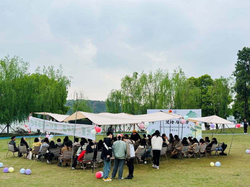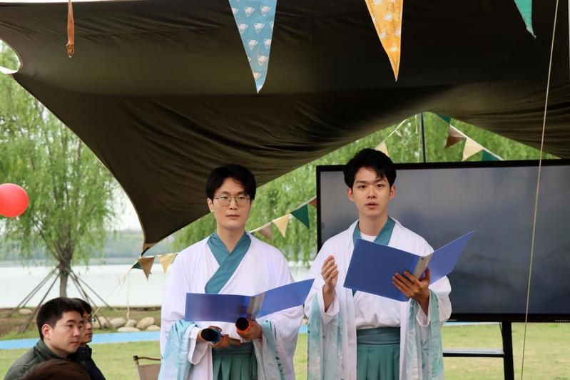 南湖畔,微微春风,暖暖春光,一曲诗词吟诵《春江花月夜》将活动拉开序幕。两位同学身着长衫,化身古人,以词会友,以诵传情,带领在座嘉宾老师与同学徜徉于千百年前的明月摇情之夜。