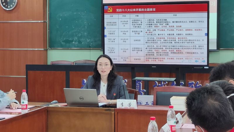 李芳从百年党史中马克思主义中国化时代化“三次飞跃”的历史逻辑阐释了“中国共产党为什么能、中国特色社会主义为什么好”。三次重大的历史决议对应着马克思时代化中国化的“三次飞跃”,每一次的“飞跃”都对应着一次重要的理论武装学习。“三次飞跃”都体现了国家领袖在危难时刻的担当,总结了历史经验和教训,在实践中锻造了马克思主义中国化新理论成果,从而更好地用党的创新理论武装全党,这也是开展主题教育的背景、遵循、意义和要求。李芳强调,党的十八大以来,党和国家先后开展了五次主题教育,今年开展的第六次主题教育坚持“学思想、强党性、重实践、建新功”的总要求,坚持学思用贯通、知信行统一,深刻领悟“两个确立”的理论意义,坚决做到“两个维护”,以全面的理论武装,对标新时代的要求,开辟新的征程。结合学院实际工作,各支部学生党员要积极通过“读·讲·行”,做到有安排、有计划、有落实、有检查,主动将党的重要理论和方针政策进行宣讲,对内坚守使命,对外散发能量,发扬学院“知行求真,诚信致远”的精神,成为广大师生群体中的一面旗帜。