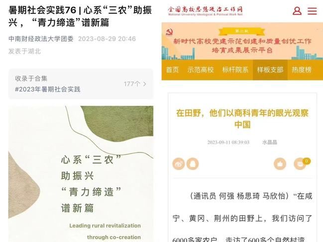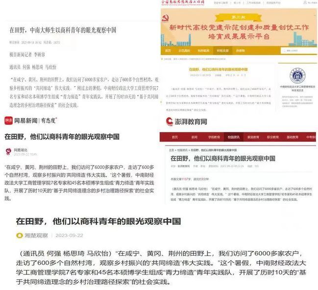各社会实践队成员们通过其实践活动和实践成果,充分展现了新时代中南大商科青年的宽广胸怀和良好精神风貌。其优秀事迹受到全国高校思想政治工作网、澎湃教育网、极目新闻、网易湖北、湘楚观察、大楚网等多家媒体报道,获得了广泛关注,展示了新时代新商科青年在青春的火热实践中绽放绚丽之花。