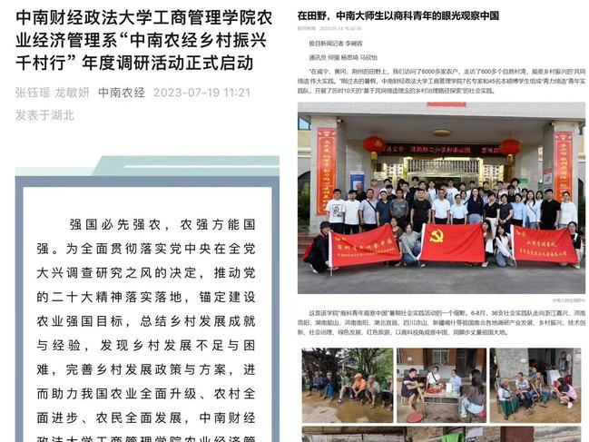 “中南农经乡村振兴千村行”由学院院长、系主任亲自领衔,农经系师生走访湖北省咸宁市、荆州市、黄冈市等千余乡村,采取座谈会、实地观察、入户走访等形式,形成调研报告、咨政建议、典型案例、学术论文等多项成果,旨在把学科专业和师资人才优势转化为高质量发展动力,巩固拓展“农情中南”党建工作牌,助力打造生态与发展互促共进的和美乡村新格局。