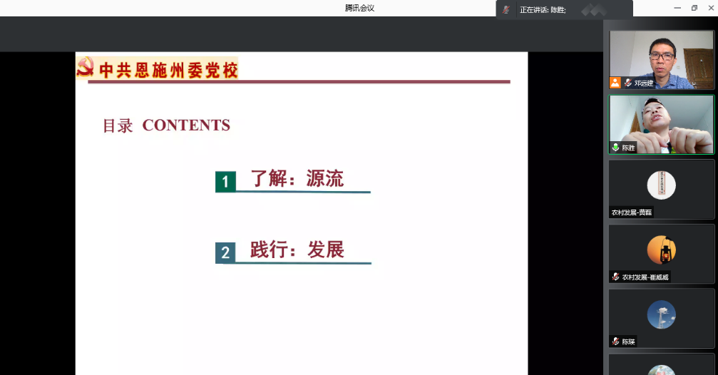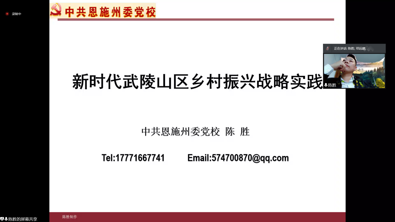 (通讯员 刘鹏)文澜大讲堂•新时代研究生思政金课“新时代武陵山区 乡村振兴战略实践”暨农业经济管理系南湖农经论坛2021年第2期(总第36期)于2021年10月11日上午08:45—10:30通过线上方式举办。本次论坛的主讲人是中共恩施州委党校的陈胜博士,由农业经济管理系主任邓远建副教授主持,农业经济管理系80余名2021级硕士新生参加了本次论坛。论坛正式开始前,邓远建副教授对陈胜博士进行了简单介绍,让大家对陈胜博士的科研、实践经历有了一个初步了解。