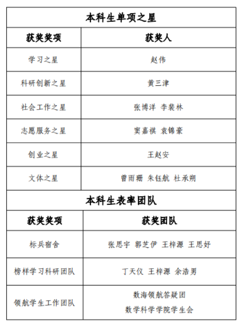 11月16日,2022年“数学之星”评选正式启动。经“数学之星”评审委员会函评与学院内公示, 赵伟、黄三津、窦嘉祺、王浩天、姜亦申、刘泽蕙等15人获评单项之星,数海领航答疑团等6支团队获评表率团队,许多、李泽彤、岳泽阳、陈永鑫、于晟伟、穆欢等29人获评优秀奖,KY开元集团官网学生会等6支团队获评优秀团队。