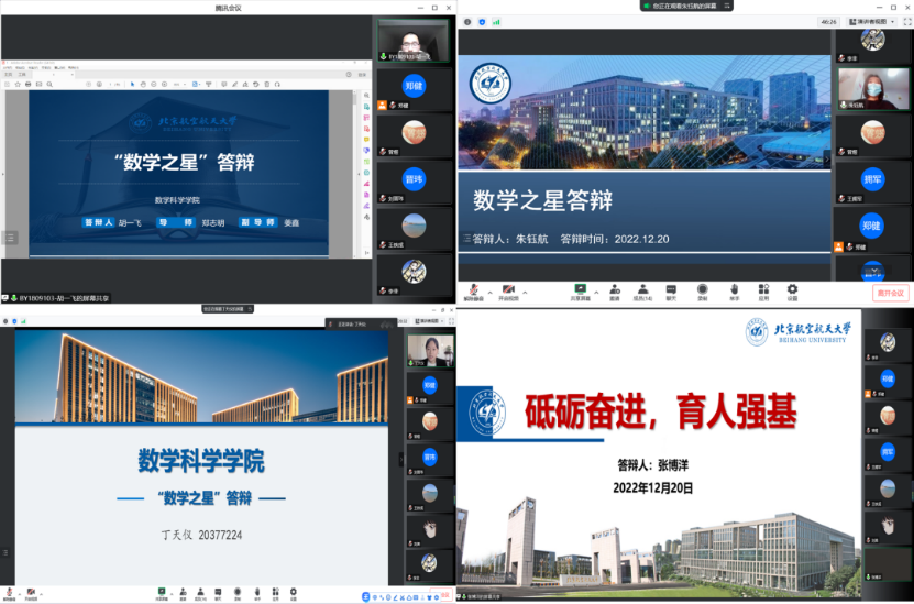 经直接报名和单项星获得者自主申请,胡一飞、丁天仪、张博洋、朱钰航等4名同学入围“数学之星”终审答辩。12月20日下午,2022年“数学之星”答辩评审会通过腾讯会议线上进行。4名同学结合学习科研经历与学生工作经历,讲述自身发展成长心迹,展现以数学锤炼思维、以数学磨砺品格、以数学融引至美、以数学服务社会的数院学子的精神风貌。经“数学之星”评审委员会评议,胡一飞、张博洋获得2022年“数学之星”。