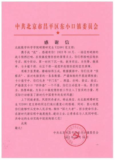 支部党员主动担当、热情奉献,将青春舞动在疫情防控的战线上,得到了东小口镇党委及都市芳园社区群众的一致好评。10月30日,东小口镇党委向支部致信感谢。11月6日,昌平团区委官方微信“昌平青年”报道支部事迹。