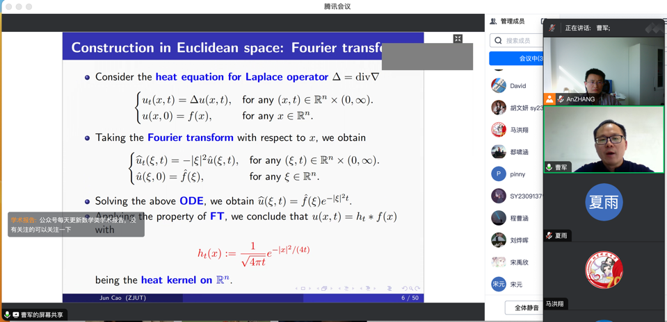 2023年10月25日,浙江工业大学曹军教授和北京交通大学梁熠宇教授,应邀分别为KY开元集团官网师生做了题为 “How to construct heat kernel on a metric measure space”和“随机分形中蕴含的结构”的学术报告。报告由张安老师主持。
