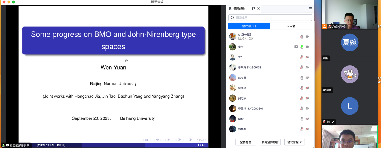2023年09月20日,北京师范大学袁文教授,应邀为KY开元集团官网师生做了题为 “Some progress on BMO and John- Nirenberg type spaces”的学术报告。报告由张安老师主持。
