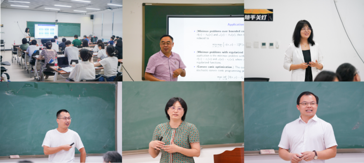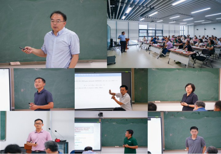 韩德仁教授和夏勇教授分别主持了本次研讨会的上午两场报告。在上午的报告中,大连理工大学张立卫教授针对一类随机凸凹最小最大值问题,提出了一种随机逼近算法,并通过初步数值结果验证了算法性能。西安交通大学徐凤敏教授结合养老金投资领域的典型场景,通过构建离散时间下的动态规划研究企业年金的长线短投问题对投资绩效的影响。南京师范大学蔡邢菊教授从常微分方程的角度给出了几个具有一阶和二阶收敛率的优化算法。重庆交通大学彭再云教授通过提出一种集值映射新的收敛性,将有关领域的内容进行延伸。南京财经大学申远教授提出了一种广义多参数邻近点算法,用于求解线性等式约束凸优化问题。
