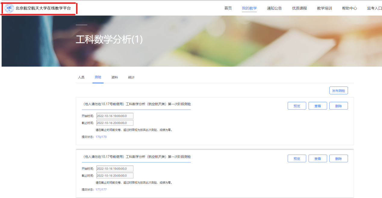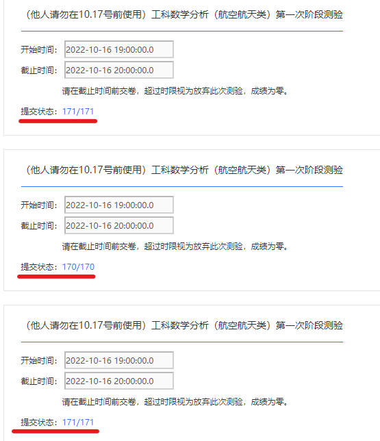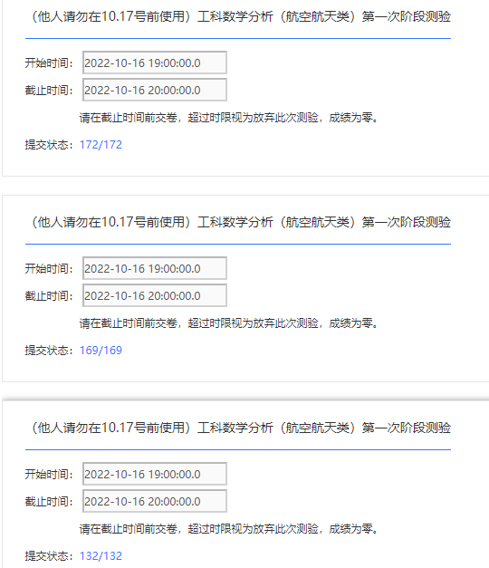 1016日晚7点—8点,工科数学分析课程组依托学校在线教学平台组织开展了一次过程性测验,1311名学生认真准备积极参加,几乎覆盖了航空航天大类全部学生,参与率接近100%。当天恰逢党的二十大开幕,在这个隆重的日子,同学们刻苦学习,积极参加线上能力测试。