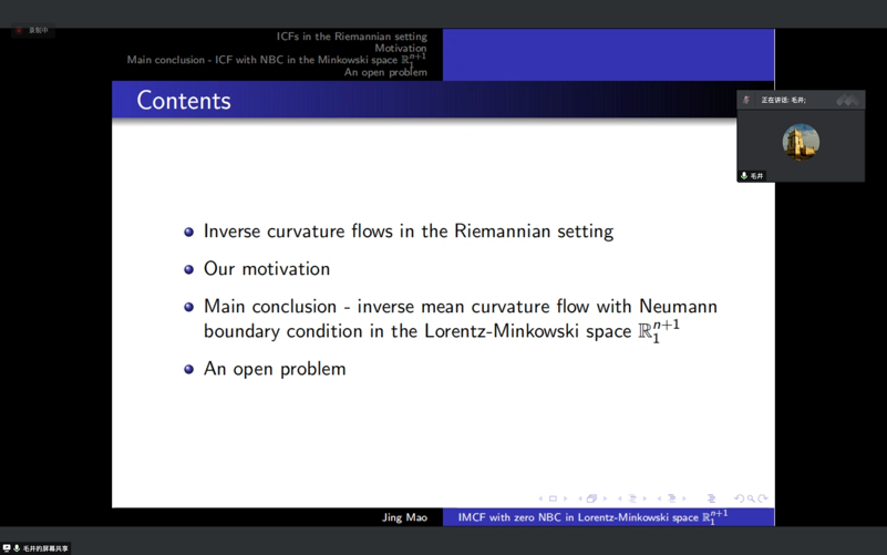毛井在报告中首先回顾了逆平均曲率流的一些经典结果,介绍了AdS-Schwarzschild空间、warped product空间下的逆平均曲率流及它们的性质,并在报告中介绍了他与合作者近期合作的工作,特别是带边曲面上纽曼边值条件下逆平均曲率流的性质。