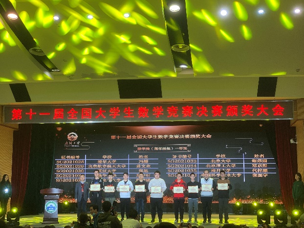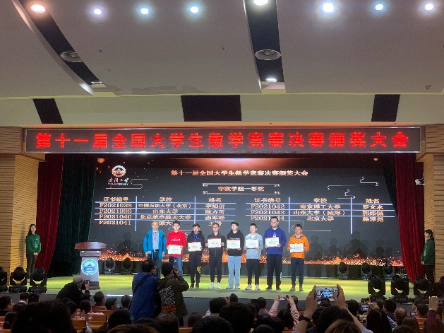 2021418日,因新冠疫情延期举行的第11届全国大学生数学竞赛决赛于武汉大学成功举行。我校共有6名同学入围本次决赛,全部在决赛中斩获奖项。在数学类决赛中,黄文欢、李佳磊两位同学分别获得一等奖、二等奖;在非数学类决赛中,我校南军锋同学获得一等奖,武东弋、陈宇轩同学获得二等奖,韩程凯同学获得三等奖。