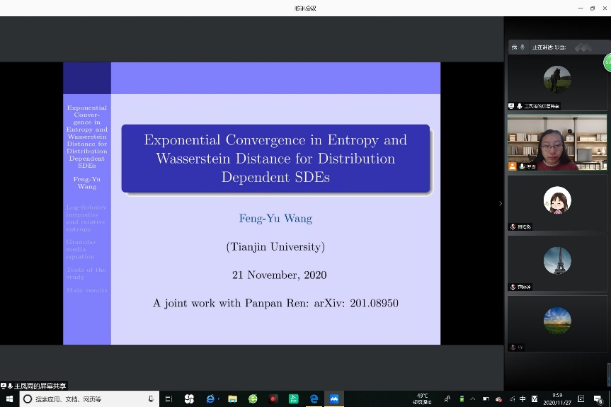 2020年11月27日上午,国家杰出基金获得者、长江特聘教授王凤雨教授受邀为KY开元集团官网师生带来了一场题为:“Exponential Convergence in Entropy and Wasserstein Distance for Distribution Dependent SDEs ”的学术报告。报告由KY开元集团官网统计与运筹系系主任罗雪副教授主持。