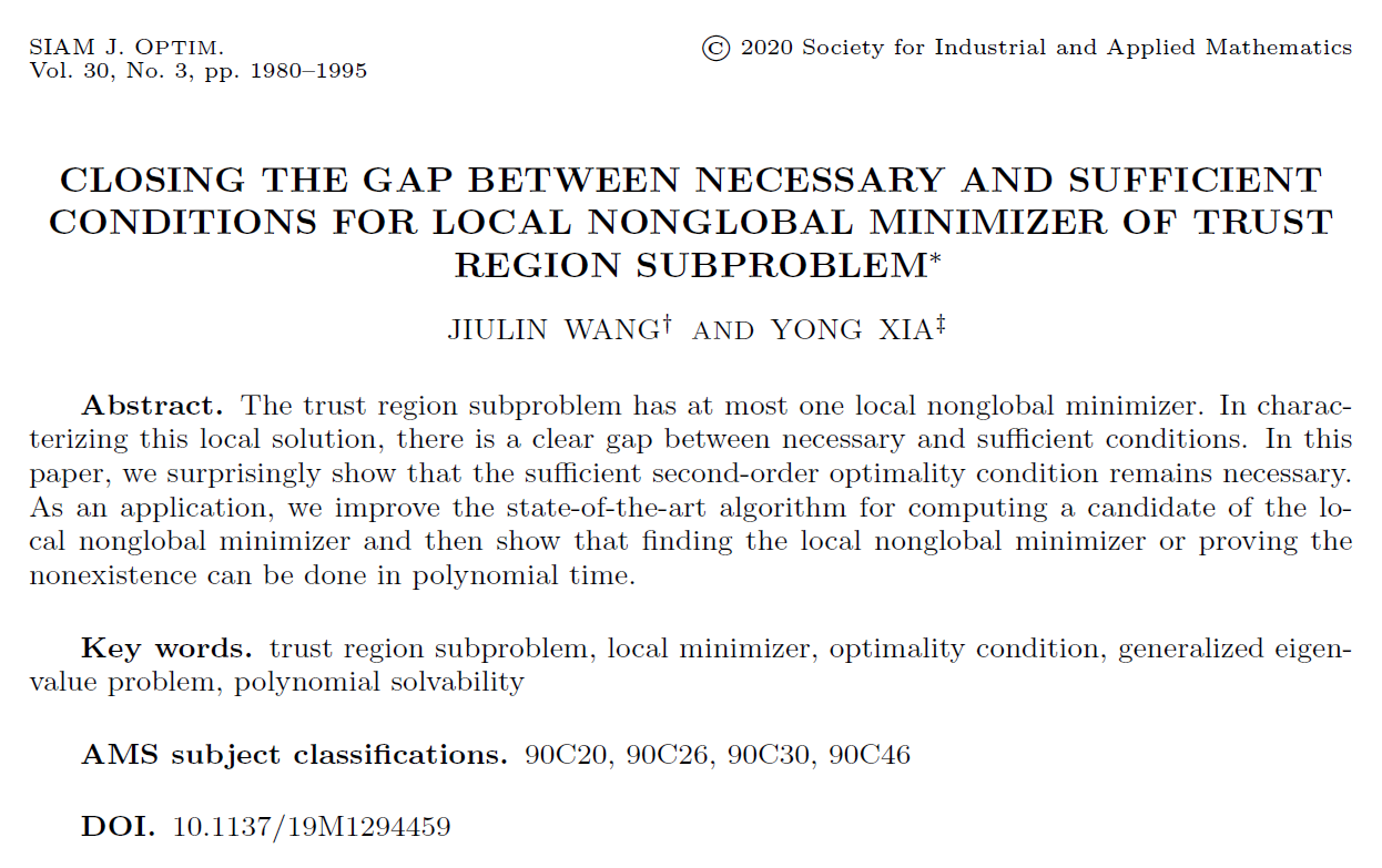 KY开元集团官网夏勇教授从2009年末接触该问题就被其所吸引并一直展开相关研究,2017级博士研究生王玖鳞从2015年做北航本科毕设起在夏勇教授指导下从事信赖域子问题的研究。2020年,他们取得了突破,首次建立了局部非全局解的充分必要的最优性条件,终结了信赖域子问题局部非全局解充分条件和必要条件之间存在了27年之久的这一间隙,首次证明局部非全局解亦可在多项式时间内可解,从而消除了信赖域子问题的Tao-An悖论。