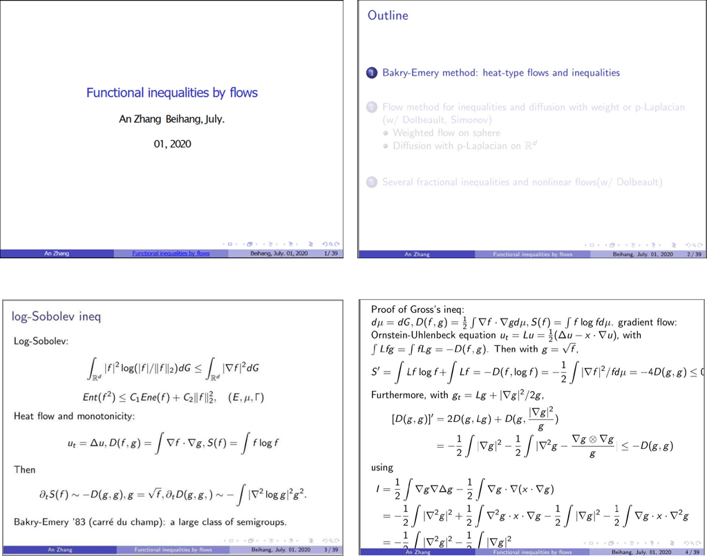 本次报告邀请到张安老师做题为“Functional inequalities by flows”的报告,该报告讨论回顾了用线性和非线性流去研究泛函不等式的历史和近期进展,介绍了Bakry-Emery方法,此法也被广泛称为 carre du champ 方法。特别地,报告人介绍了通过非线性扩散流和扰动正则化方法去研究最优的加权不等式和极值函数。同时,通过将Renyi entropy power 方法推广到带p-Laplacian 的双退化扩散方程上进而对三种Lp(p\neq)2 指标的Gagliardo-Nirenberg不等式给出了全新的流方法证明。最后,报告人还介绍了一类分数次不等式以及与分数次流之间的关系, 研究了不等式的极值状态和流的长时间行为之间的对应关系。