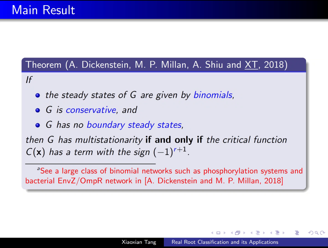 [3] A.Dickenstein, M. P. Millan, A. Shiu and X. Tang. Multistationarity in StructuredReaction Networks. Bulletin of Mathematical Biology. 81 (5): 1527–1581, 2019.