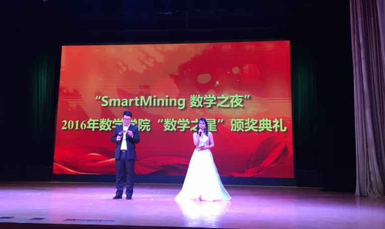 数学学院2015年设立“数学之星”奖项,表彰在学习、科技实践、社会工作、志愿服务、创新创业以及文体方面表现突出的同学,树立宣传学习的典范,2016年在95级校友徐晶的赞助支持下,学院举办首届“SmartMining 数学之夜”2016年数学学院数学之星颁奖典礼旨在表彰数学优秀学子,展示数学校友风采,传承数学大爱文化。 颁奖典礼在“走红毯”的仪式中拉开帷幕。在同学们的热情洋溢的欢呼声中,众位校友、老师以及获得奖项提名的同学们分别走过红毯,在签名版签到与同学们合影,在同学们的眼中,他们就是闪耀光芒的“明星”。