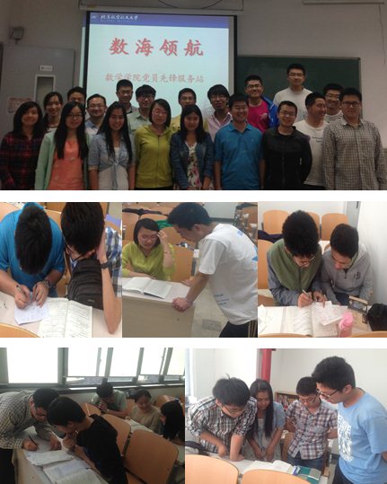 活动内容: 全校同学都可以到教室来,没有专业、年级限制,目前开通以下能: (1)数分、线代、概率等专业课程答疑,解题技巧,题型总结 (2)数学竞赛,建模比赛经验分享,问题讨论。 (3)论文撰写技巧,侧重于与数学相关领域。 (4)想与数学专业同学合作项目,登记相关信息后帮忙联系。 加入我们:(1)现场参与:2014年5月7日——6月22日,每周三下午3:20——5:20,沙河校区J5-204教室。现场会有至少7人数学学院学生党员,包括本科生、硕士研究生、博士研究生,其中研究生至少2人,且必有专业大神,成员实力有保障。(2)线上参与:时间原因不能参加现场答疑的同学,可在ihome或人人上添加【数海领航】为好友,有问题直接发图@我们,或者留言。每周服务站会选派7人线上值班,保证解答速度。(3)质量保障:服务站答疑质量和累计时间将作为学院考察入党积极分子和预备党员的重要渠道,有正规的组织和监管,如有发现态度不端的服务站成员,可以随时通过ihome【数海领航】公共主页、人人主页或者向现场负责人投诉。 联系我们:站长信箱:shuhailinghang@163.com ihome主页:数海领航 人人主页:数海领航欢迎广大师生多提宝贵意见和建议,诚邀您的加入!