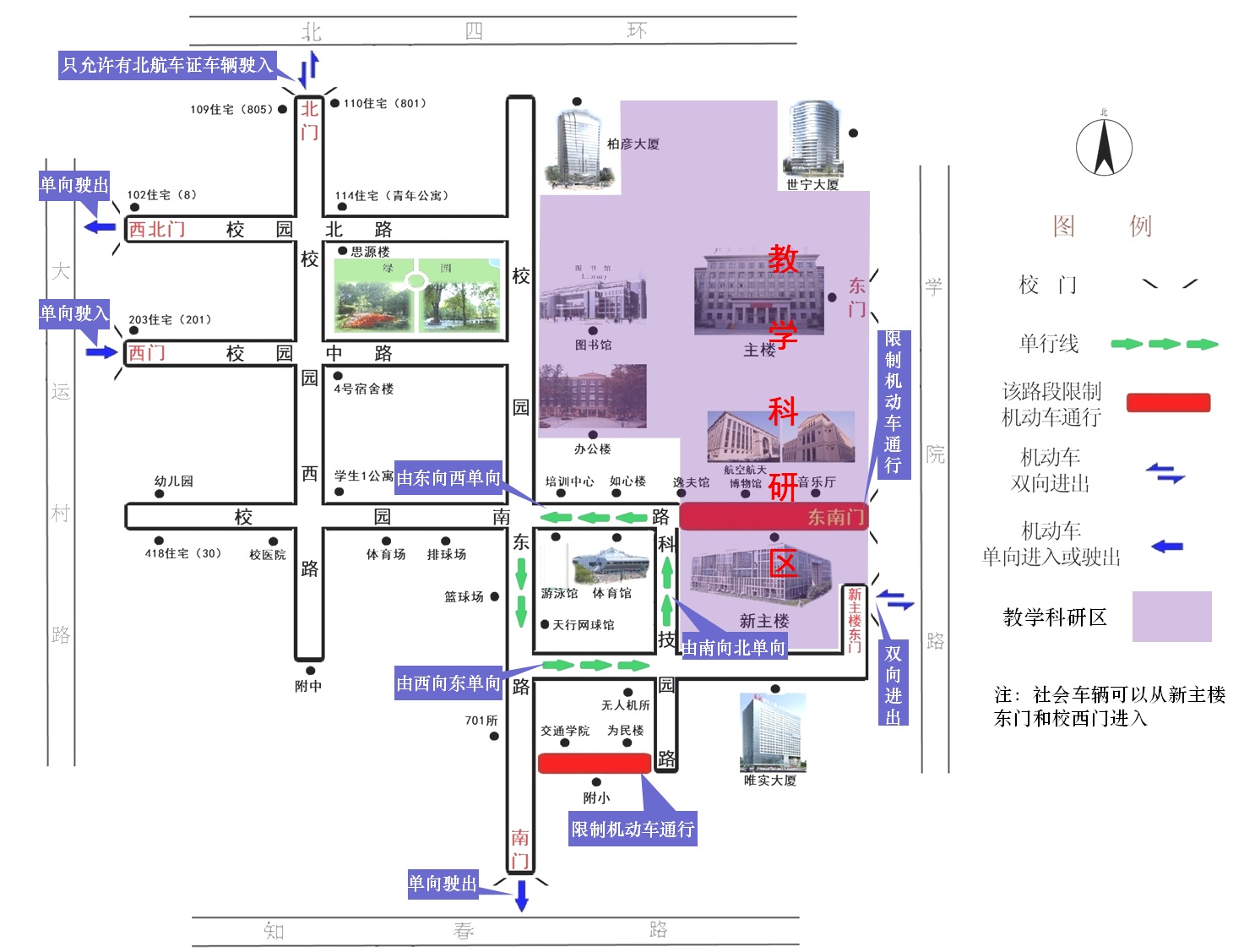 一、将办公楼和逸夫科学馆以东区域、校园南路东段(新主楼北侧)、新主楼纳入学校教学科研区的整体管理,教学科研区内限制机动车通行(救护车、消防车、洒水车、绿化专用车等各类型特殊车辆除外)。