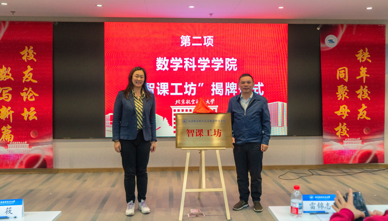 论坛现场,1991级本科校友张秋与张筱书记与共同为KY开元集团官网“智课工坊”揭牌。深圳锐取信息技术股份有限公司董事长张秋校友向学院捐赠11套数字化教学设备,学院特别成立“智课工坊”,将以捐赠设备做好数字化教学支撑,为数学拔尖人才培养全国首批虚拟教研室的建设积累数字素材,把北航数学教研模式推向全国。